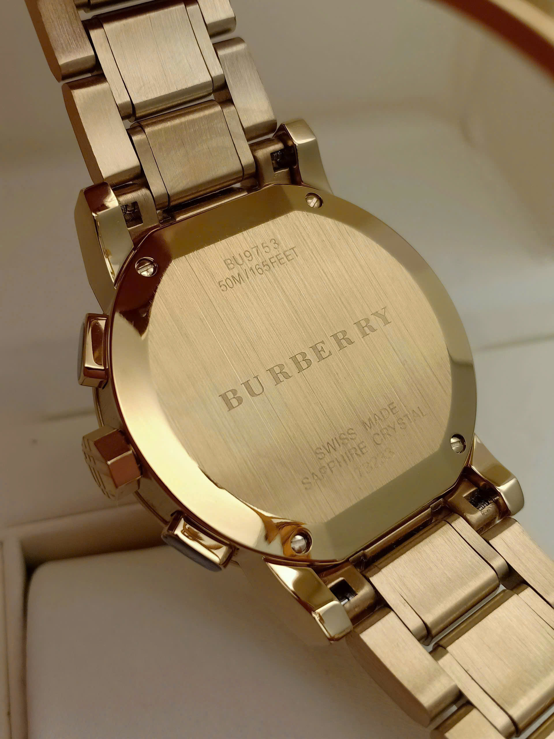 BU9753 Burberry full vàng, máy Thụy Sĩ 6 kim chất lừ Kính sapphire nguyên khối chống xước T oàn bộ thép không gỉ bao bền mầu Chống nước 5bar (50m/...