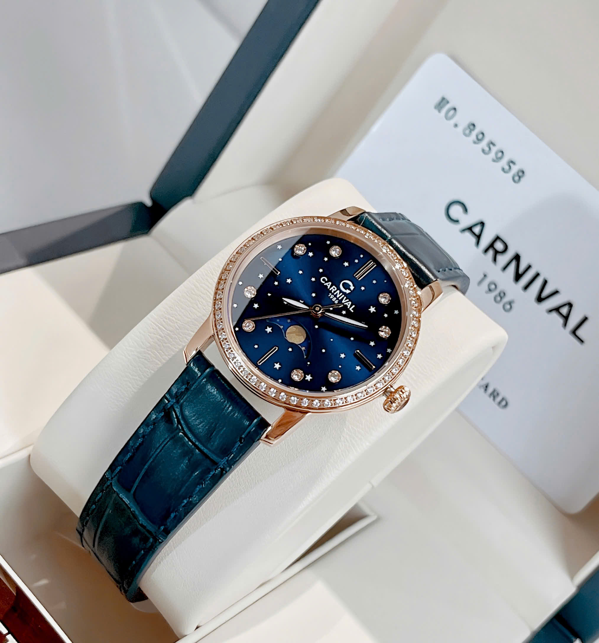 Carnival Moonphase đẹp xuất sắc với thiết kế vô cùng xinh xắn và bắt mắt 💕 🔹Case 32mm vừa vặn mọi size tay 🔹Viền rose god đính full đá lấp...