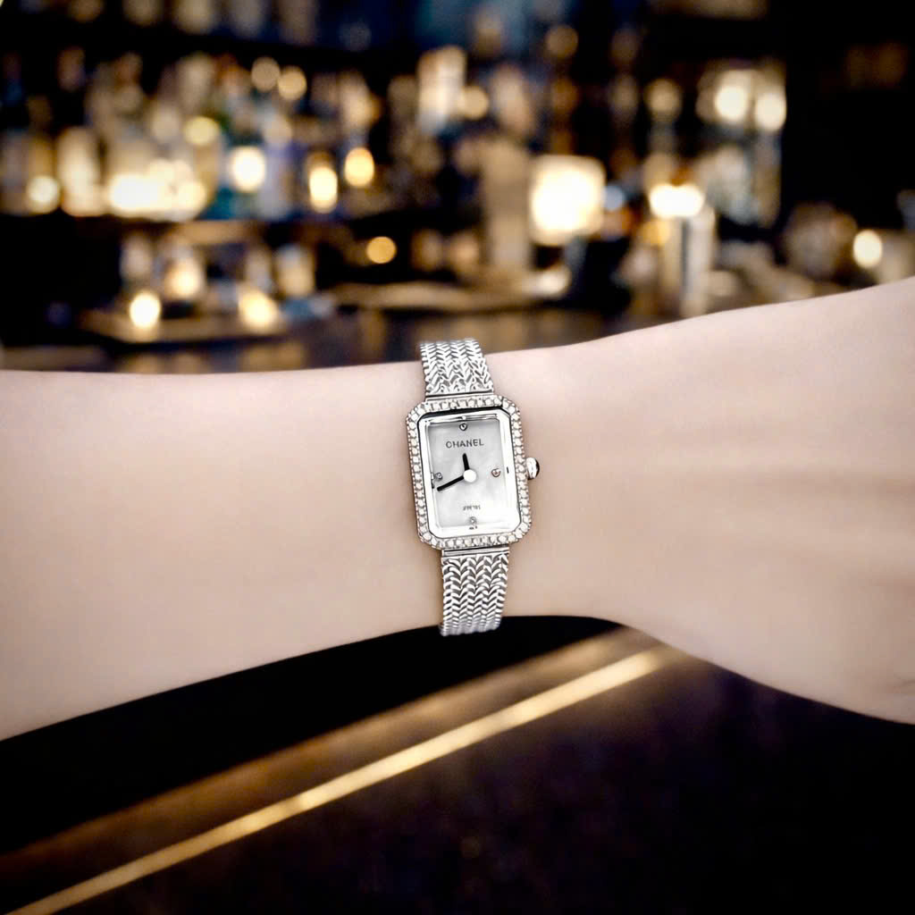Chanel Première – Vẻ Đẹp Thanh Lịch Trên Cổ Tay • Đồng hồ Chanel Première thiết kế mặt vuông biểu tượng, viền đính đá lấp lánh, dây thép đan tinh...