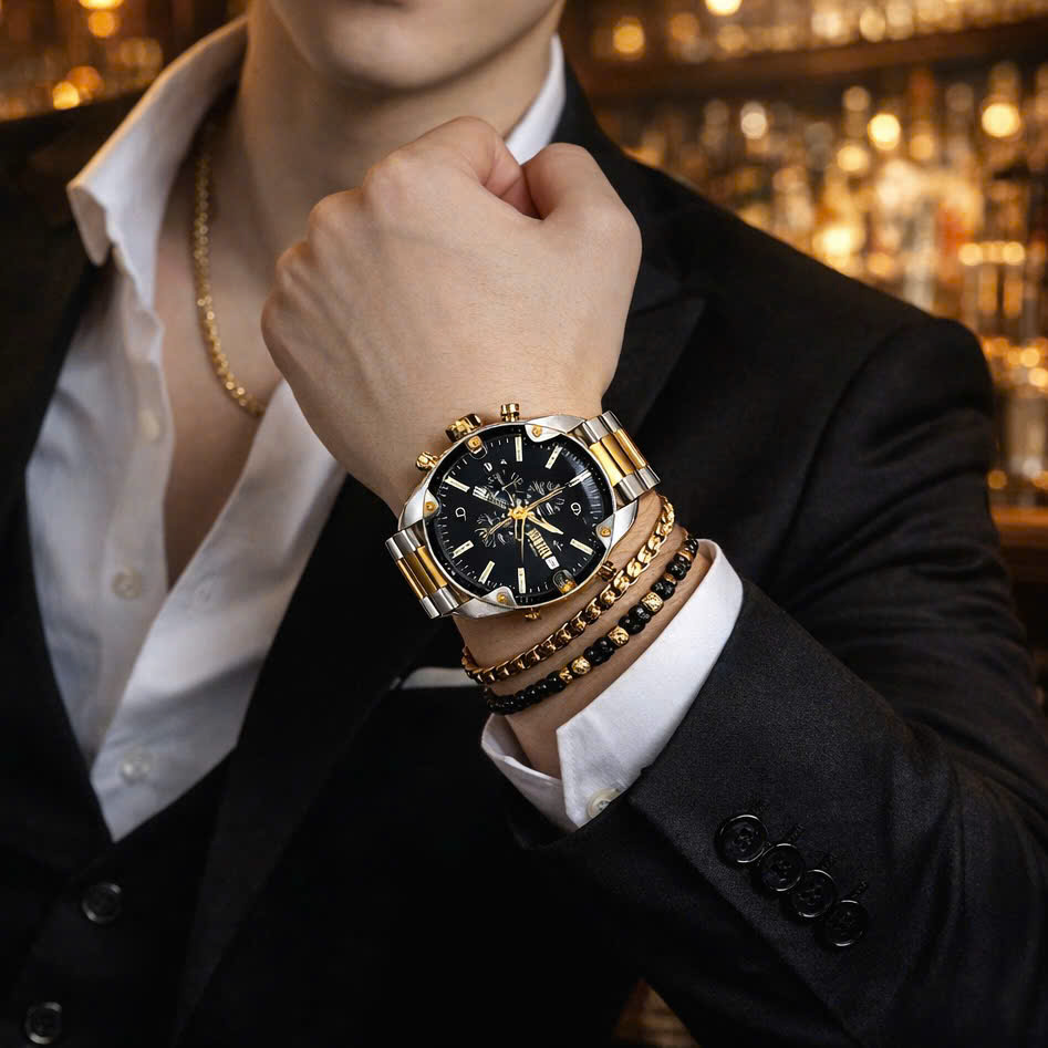 • Đồng hồ Diesel nổi bật với mặt đen chronograph cá tính, vỏ thép chắc chắn và dây kim loại demi vàng–bạc sang trọng.