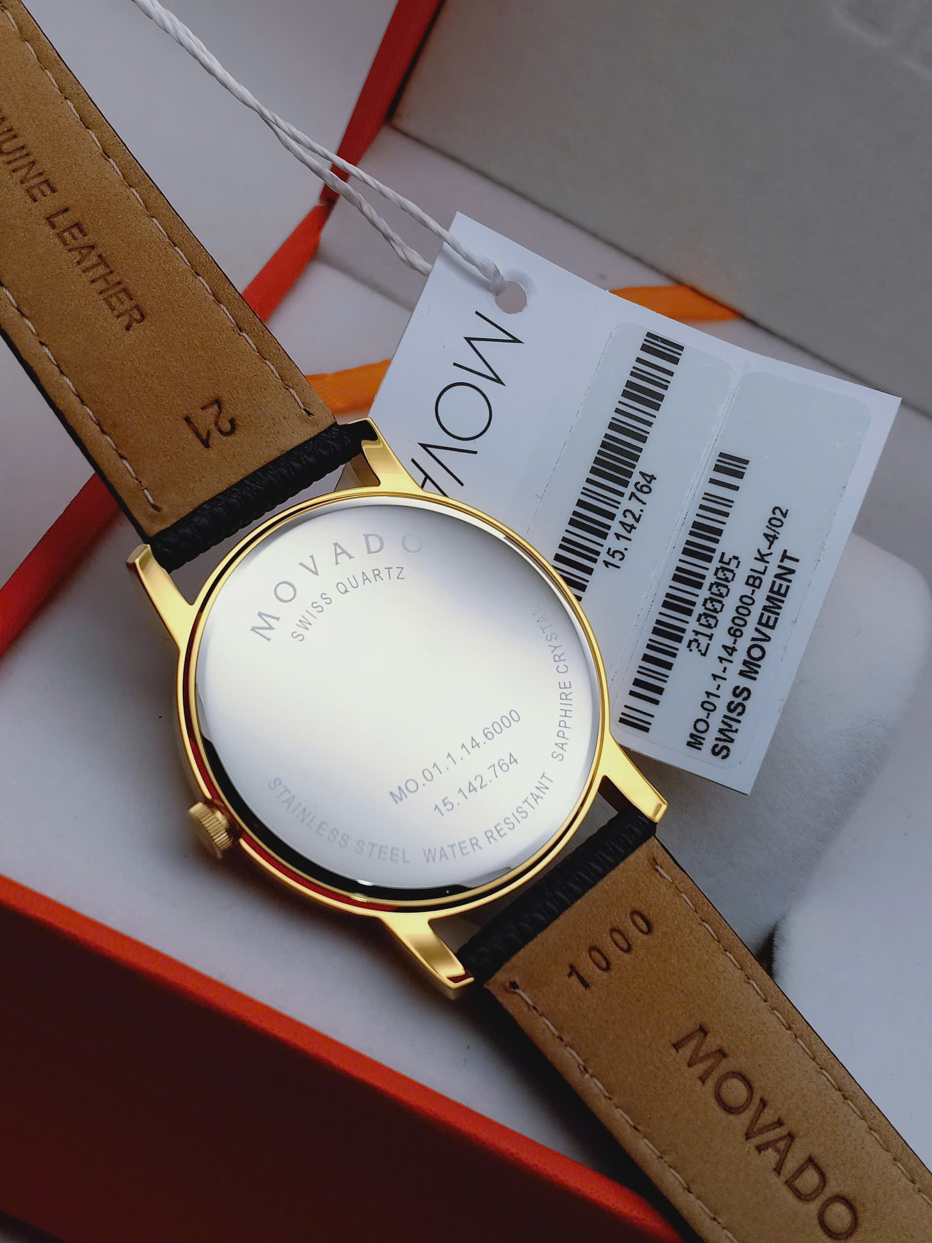 🍒Movado Thụy Sĩ bản dây da. Thiết kế tối giản nhưng nổi bật với mặt số tròn lớn và vỏ màu vàng sang trọng. 💗Logo chấm tròn vị trí 12h...