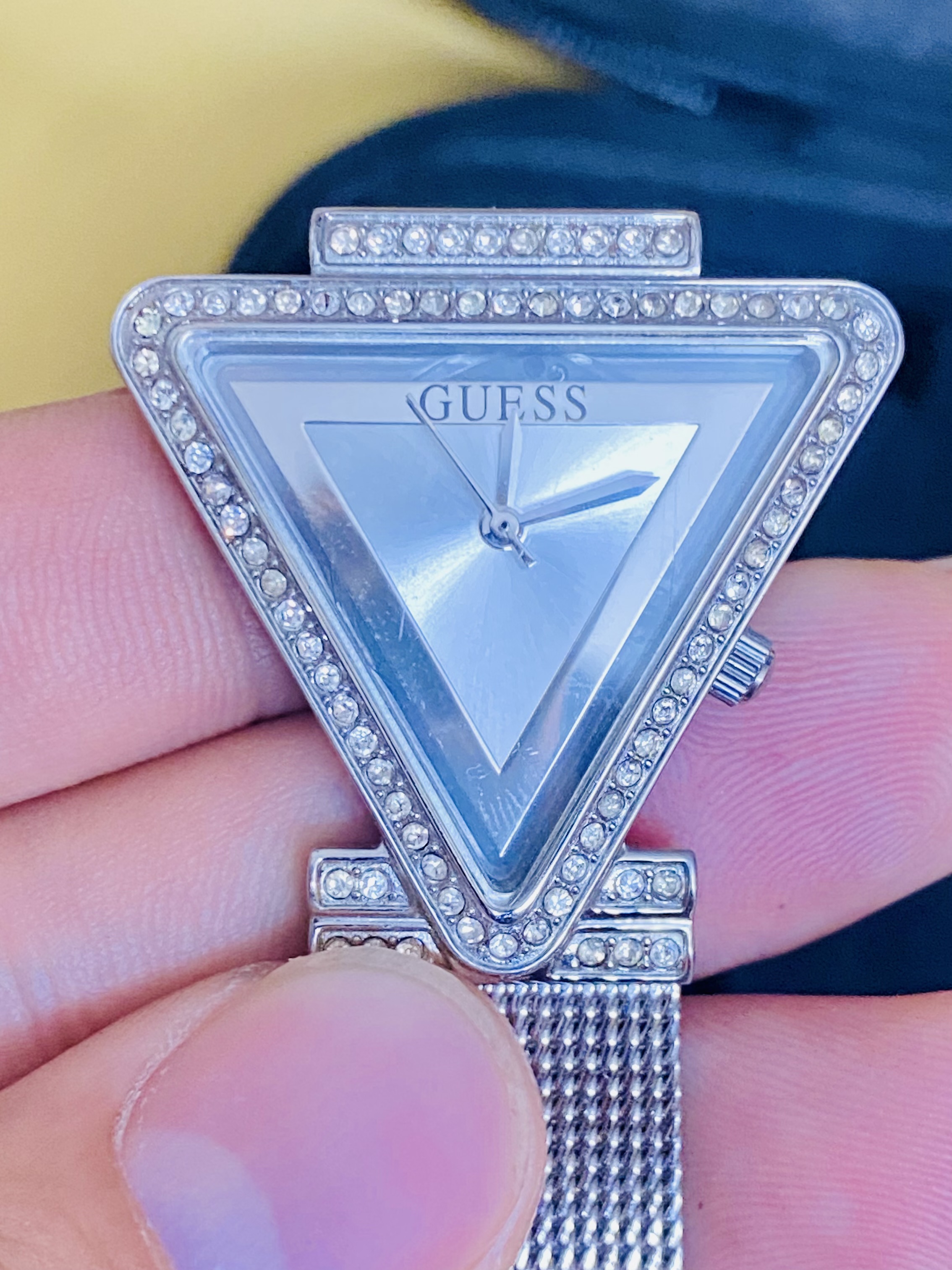 Thiết kế: Đồng hồ có thiết kế mặt số hình tam giác ngược độc đáo, mô phỏng theo logo đặc trưng của thương hiệu Guess.