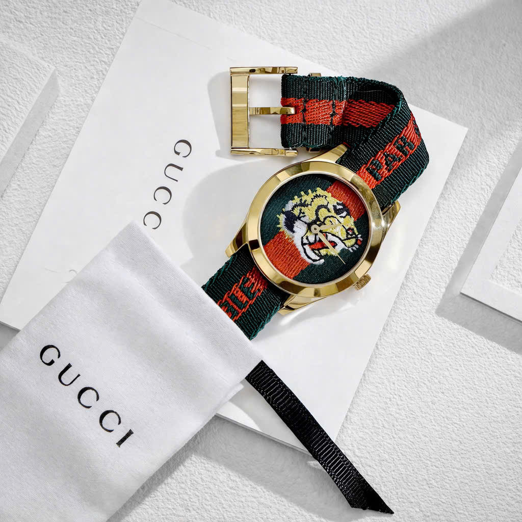 GUCCI 𝐋𝐞 𝐌𝐚𝐫𝐜𝐡𝐞́ 𝐝𝐞𝐬 𝐌𝐞𝐫𝐯𝐞𝐢𝐥𝐥𝐞𝐬 𝐘𝐀𝟏𝟐𝟔𝟒𝟖𝟕 • Size 39mm. Máy QUARZT. Unisex •mặt họa tiết thêu nổi bật đậm chất Gucci ❣️dây nato 3 màu xanh lục đậm phối đỏ...