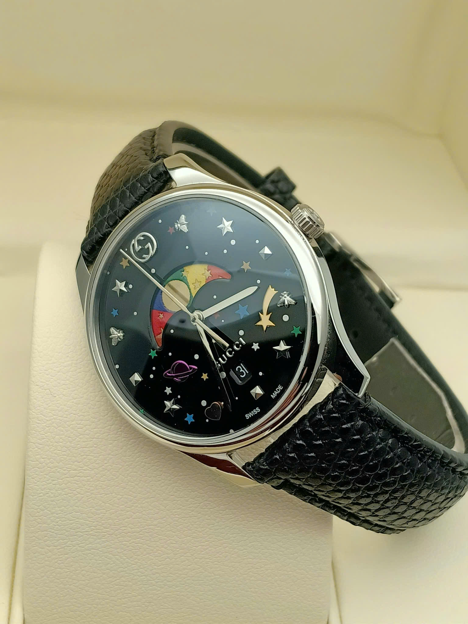 Gucci G-Timeless Watch 36mm Bộ sưu tập: G-TIMELESS Loại máy: Quartz Đường kính: 36mm Màu sắc: Đen Chất liệu dây: Dây Da Độ chịu nước: 5 ATM