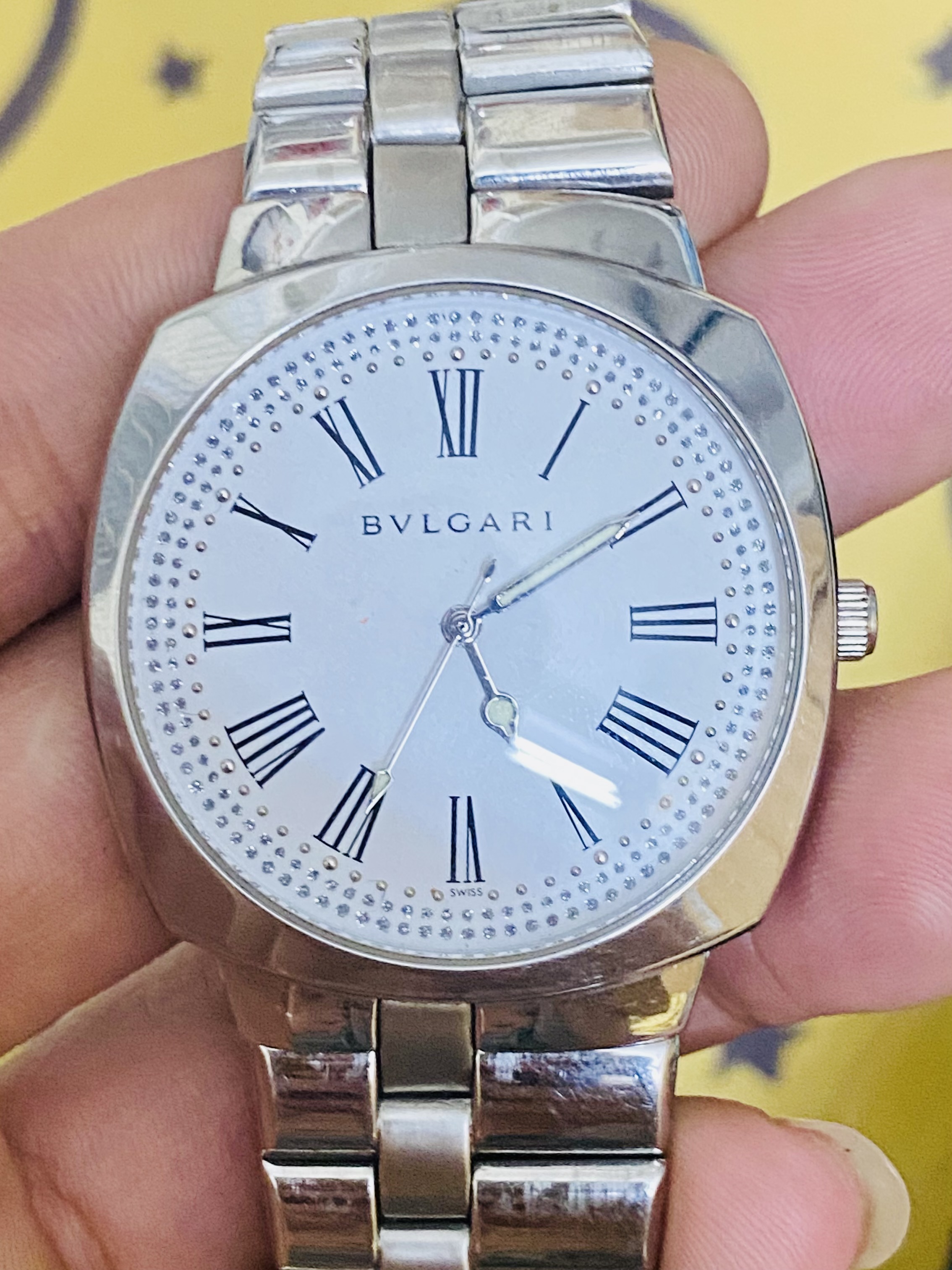 Kiểu dáng: Form vỏ hơi vuông bo tròn ở các góc, mang hơi hướng của dòng Bvlgari Octo hoặc các phiên bản thời trang tương tự.