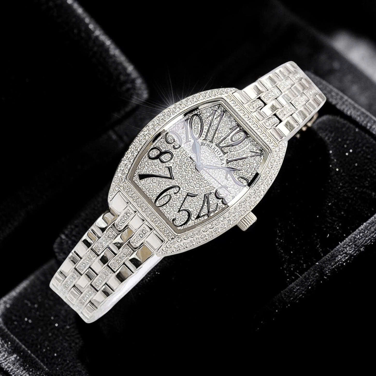 Roberto Era RE0215 - Thiết kế độc lạ, khảm full kim cương Moissanite siêu sáng Bản silver siêu hot ❣Case 36mm,dáng oval đeo cực ôm tay ❣ Toàn bộ full...