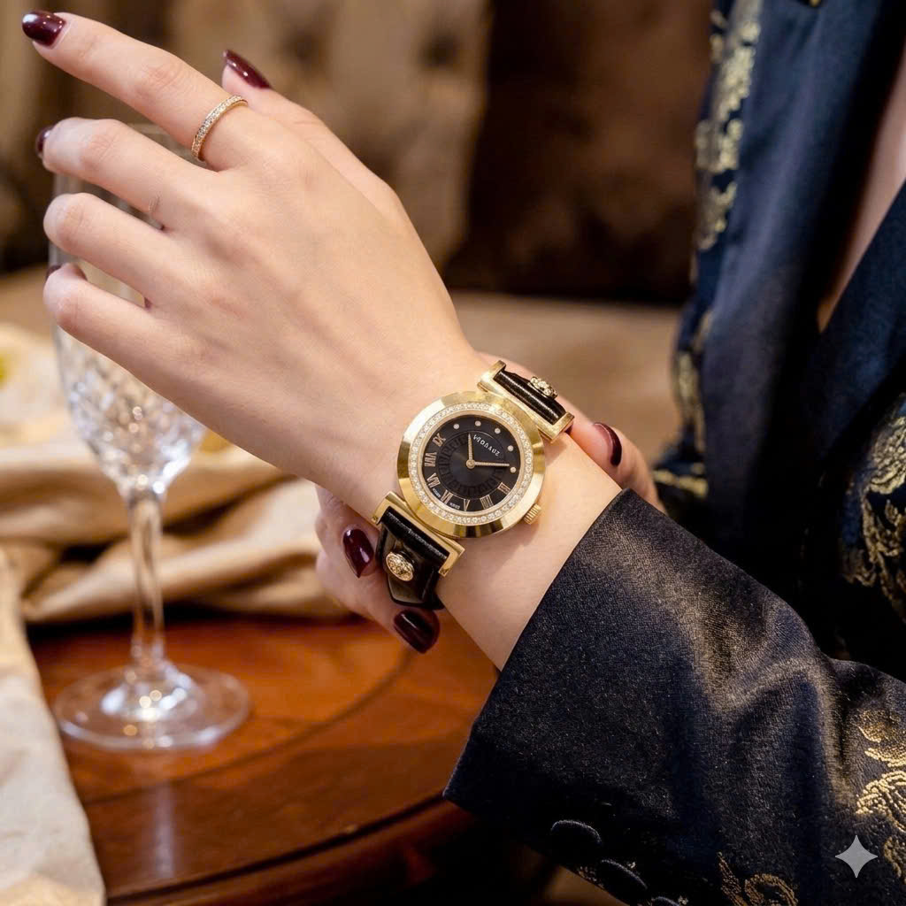 VERSACE 𝐕𝐚𝐧𝐢𝐭𝐲 ▪️niềng đá .thép không gỉ mà PVD. dây da ▪️máy: QUARZT. chống nước:3atm ▪️nữ :35Mm . Bề dày:7.5mm